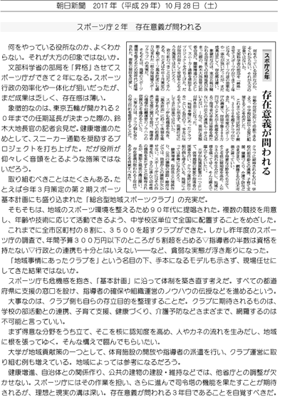 朝日新聞朝刊に「スポーツ庁」の記事が掲載されていました。