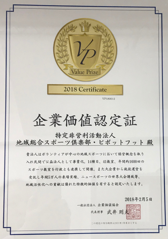 「特定非営利活動法人地域総合スポーツ倶楽部・ピボットフット」は企業価値認定を受けて、
